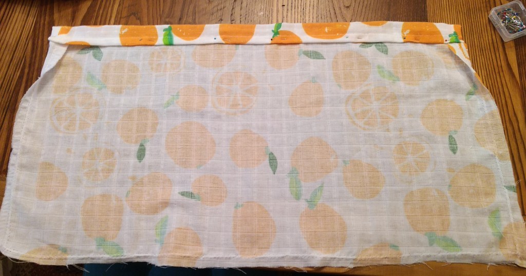 5. Next, fold the top hemmed edge down so it’s in line with your 3″ marks. Pin and sew in place to create a 1½” casing for your drawstring.