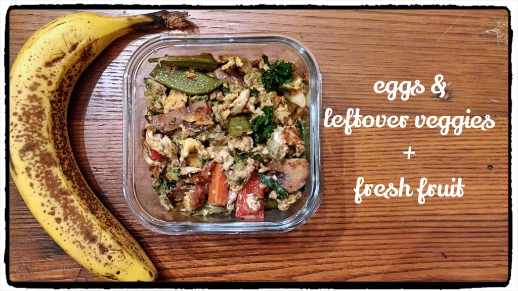 Eggs and leftover veggies for breakfast. I’ll top this with a little Avocado ranch and everything but the bagel seasoning and have a piece of fruit on the side.