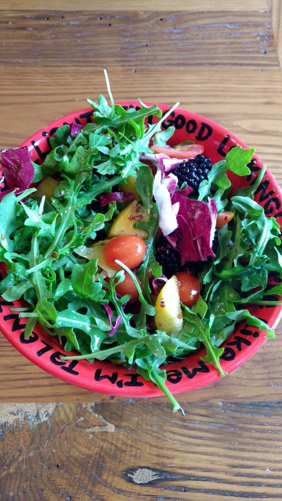 For lunch, I’m eating salads. God help me, I need more salads in my diet to balance the peanut butter cups, sourdough, banana bread and cookies we’ve been making in this house! This salad was arugala, radicchio, cherry tomatoes, 1/2 a peach, blackberries and a little bit of quinoa. The dressing was grapefruit juice, olive oil, salt and pepper. There wasn’t really a recipe for any of this. You can use any greens you have, any berries and any citrus juice with your dressing.