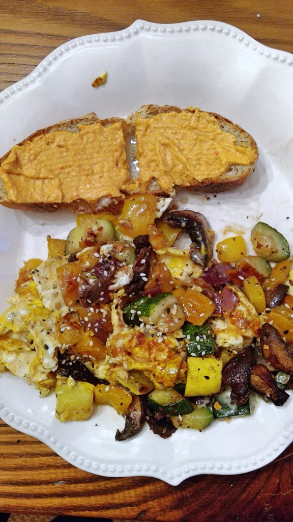 For dinner, as I mentioned, I’ve been trying my hand at sourdough bread. I got a starter from my friend, Melinda, and I’m still able to get flour in bulk. So far, I’ve tried the King Arthur Rustic Sourdough Bread recipe. It made 2 loaves so I’ve been working my way through them. I could start a whole series on just different toasts I’ve been making! My go-to topping is a roasted red pepper hummus with a side of roasted vegetables and eggs. I could eat this meal everyday, and, honestly, I have! For the vegetables, just pick your favorites and then roast them at 425 for 12 minutes with your favorite spices. I like Monterey Steak Seasoning, or if you can’t find that in stores, something like this.