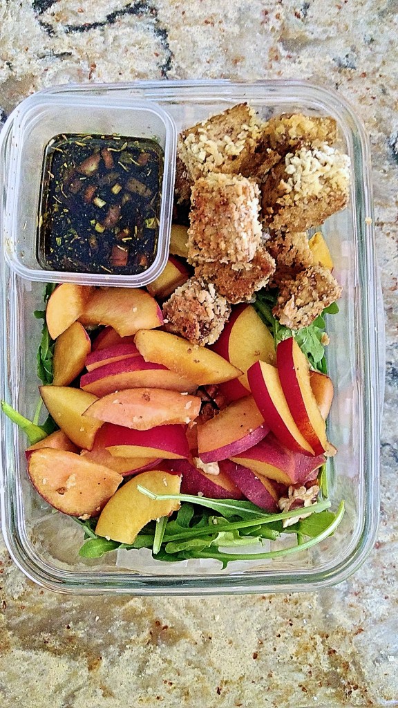 Warm weather also means more salads. This summer stone fruit salad has baby arugala, nectarines, plums, pecans and baked tofu. I marinated the tofu briefly in a balsamic vinaigrette (also the dressing on the side) and coated it in cornstarch and panko crumbs but I don’t love how it came out so I’m still working on that. I think a simple grilled tofu would actually taste better with the summer fruit. I’ll add avocado when I’m ready to eat it.