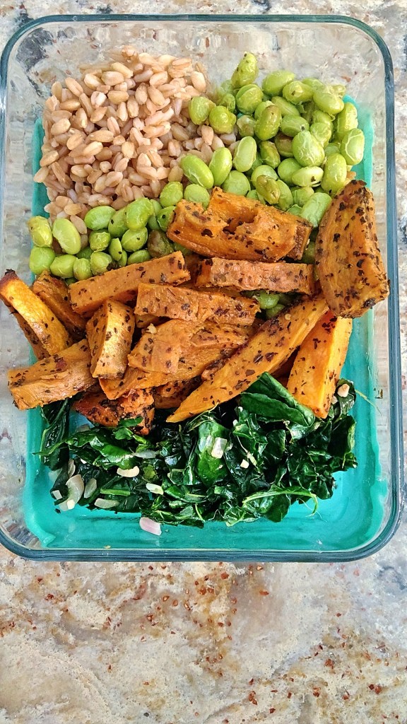 Dinner is my go-to Buddha Bowl, which I’ve posted before. I make it with farro and roast the edamame. This comes together pretty easily and is really filling. As a trick, I roast the edamame and sweet potatoes side by side on the same baking sheet to save time (and dishes to clean) and cook the farro while those are in the oven.