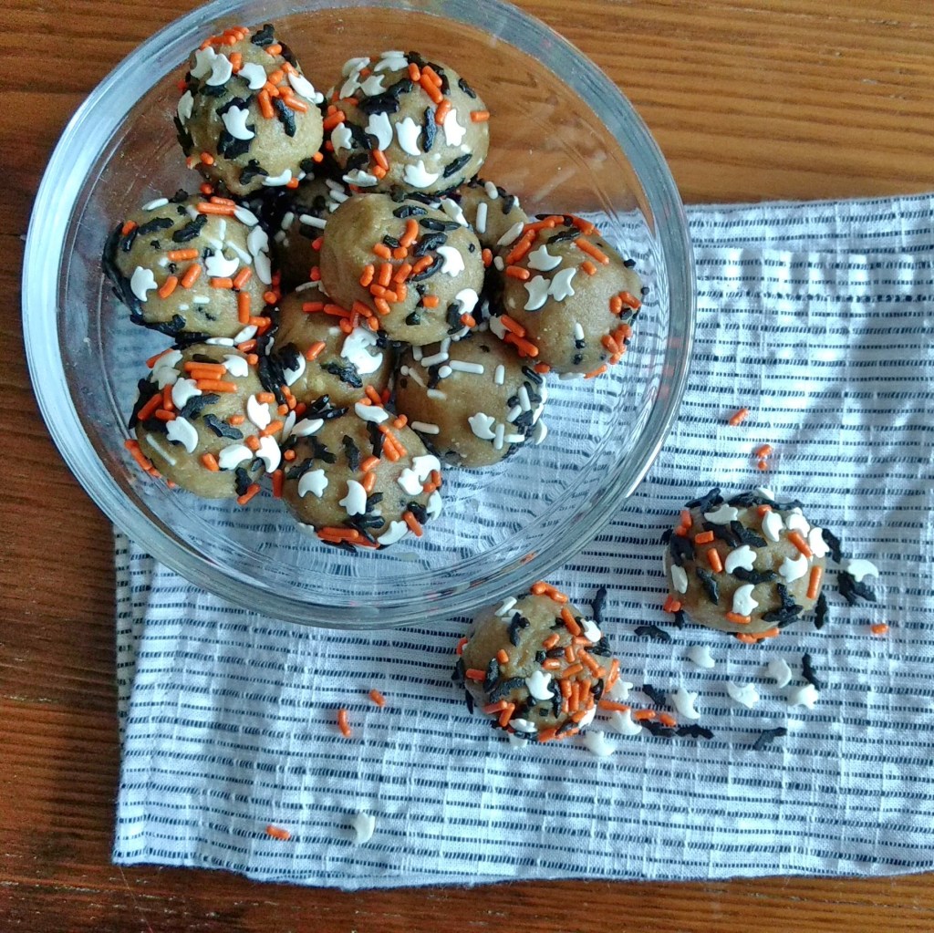 Jessica Eat’s Real Food No-Bake Cake Batter Bites– um, are those Halloween sprinkles in the middle of summer? Why, yes- yes they are! One cannot make Birthday Cake Bites without sprinkles. Unfortunately, I only had Halloween and I didn’t want to go buy more so I used what I had! Interestingly enough, these sprinkles came in a glass container with a cork stopper and I think I bought them at Target. The brand is Dean Jacobs. Just a heads up if you are trying to find plastic free options.