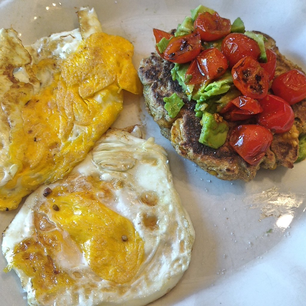 Anyway, in the cookbook, Jessica served the corn cakes with fresh tomatoes, avocado and poached eggs. I tweaked the recipe a bit because 1. I can’t poach an egg and 2. I liked the warm, garlicky sauteed tomatoes with the cold avocado. To meal prep, make a batch of the corn cakes ahead of time. In the morning, fry up your eggs and then add the tomatoes and garlic to the same pan as your eggs (no sense dirtying 2 pans!) as your eggs cook. Microwave the corn cakes for 1 minute or pop them in the toaster.