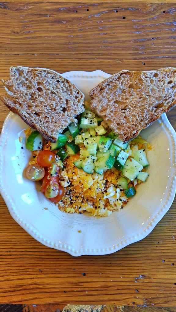 I also like the buffalo hummus mashed up with a hard boiled egg and with fresh cucumbers and cherry tomatoes folded in. I’ll top this concoction with Everything But the Bagel seasoning and serve it over homemade sour dough (which I’ve linked to multiple times now but it’s still me favorite). It sounds weird but I sort of think of it as an egg salad with hummus instead of mayo. Also, it doesn’t require turning the oven on so it’s been a good meal for the hot summer days. I had this during the week as another brunch option (I try not to have eggs with two meals). I just hard boil eggs on the weekend and then, in the morning as my bread toasts, I mix the eggs with the hummus, cucumber and tomatoes. It comes together fast.