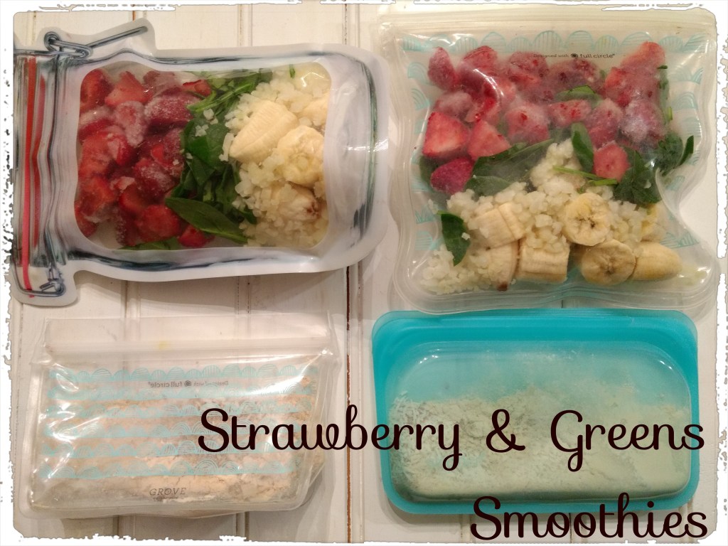 For meals this week, I’m making smoothies with Strawberries and Greens for breakfast. I froze 1 banana, 1/2 c. riced cauliflower, 1/2 c. spinach and 1 cup of strawberries. In a separate bag, I have vanilla vegan protein powder, 1 TBSP ground flax and 1 TBSP of coconut. In the morning, in addition to my frozen produce and dry mix, I will add 1 cup of almond milk and 1 TBSP cashew butter. If you aren’t able to make your smoothies in the morning due to time or roommates, I highly recommend purchasing a stainless steel water bottle. Contigo and Yeti both have good options. Make your smoothie at night with some ice, store it in the fridge in your stainless steel container and it will still be ice-y cold in the a.m.