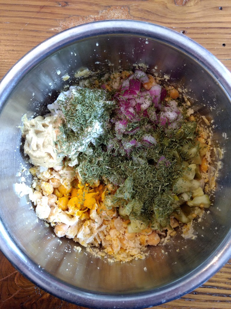 Lunch was chickpea salad in the homemade pitas I made a few weeks back. I’ve kept them frozen so they’ve lasted me longer then I intended but as I haven’t made bread in a while, this ended up working out well! I REALLY liked the pickles mixed into the recipe. I used some homemade pickles and vegan mayo then added avocado and tomatoes to the pita. I had planned on adding some greens but the pitas never have as much room as I think they will. If you want to load on the vegetables, a wrap would work better but you could make this into any time of sandwich you want.