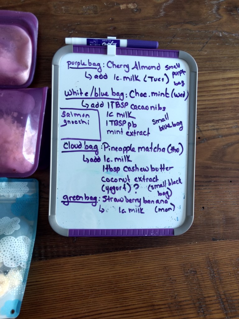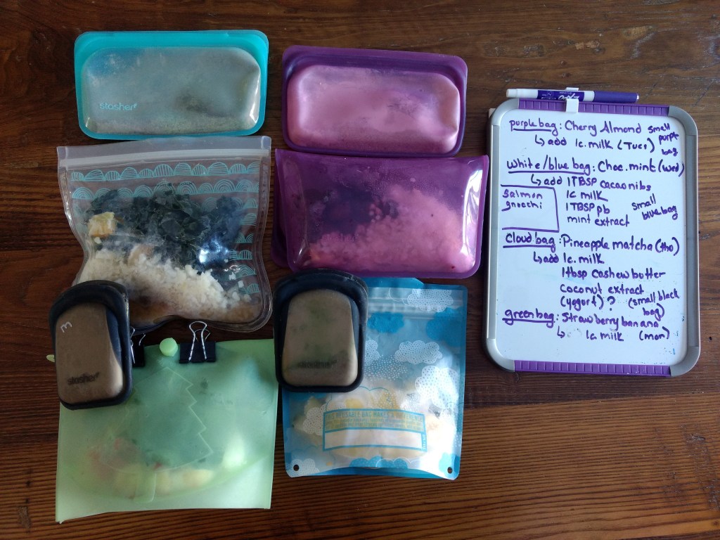 So, first up, for breakfast I made smoothie packets. I didn’t have enough ingredients to do the same smoothie each day, like I normally do. Instead, I pulled out the frozen fruit and vegetables I had in my freezer and made a bunch of different flavors.