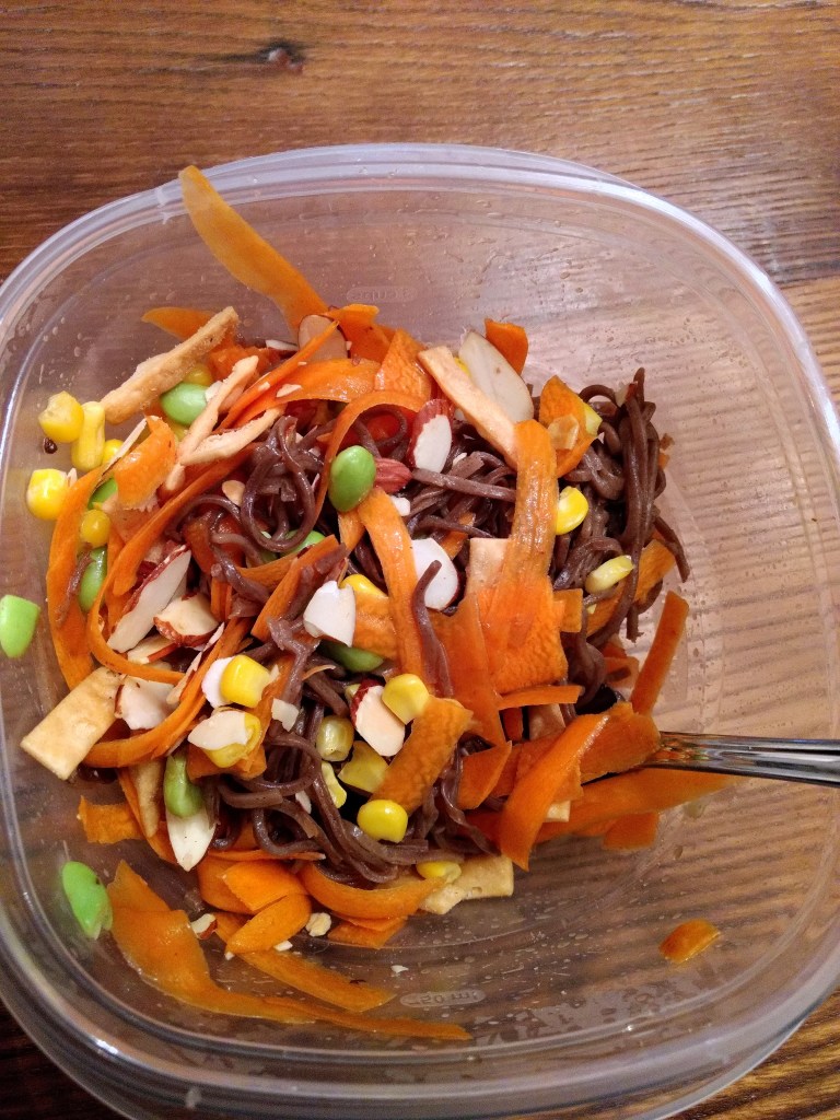 For dinner, tonight I am having some leftover soba noodles. I paired the noodles with some frozen edamame, corn and leftover carrots and some ginger sesame dressing.
